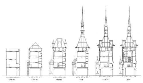 The Zytglogge's internal layout has changed over time to reflect the tower's change of purpose from guard tower to city prison to clock tower. The thirteenth-century guard tower was not much more than a hollow shell of walls that was open towards the city in the east.[29] Only in the fourteenth century was a layer of four storeys inserted.[30]