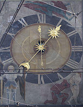 The clock dial has been dated to either the building phases of 1405 or 1467-83,[26] or to the installation of the Brunner clockwork in 1527-30.[27] Ueli Bellwald notes that the planisphere uses a southern projection, as was characteristic for 15th-century astronomical clocks; all later such clocks use a northern projection. This would seem to confirm the dating of the clock to the 1405 or 1467/83 renovations.[25]