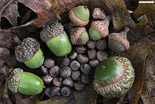 Acorns play an important role in forest ecology when oaks are the dominant species or are plentiful.[4] The volume of the acorn crop may vary widely, creating great abundance or great stress on the many animals dependent on acorns and the predators of those animals.[5] Acorns, along with other nuts, are termed mast.