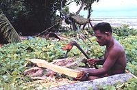 Micronesian of Tobi, Palau, making a paddle for his wa with an adze