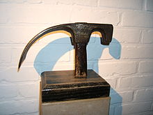 The adze is depicted in ancient Egyptian art from the Old Kingdom onward.[1] Originally the adze blades were made of stone, but already in the Predynastic Period copper adzes had all but replaced those made of flint.[2] While stone blades were fastened to the wooden handle by tying, metal blades had sockets into which the handle was fitted. Examples of Egyptian adzes can be found in museums and on the Petrie Museum website.