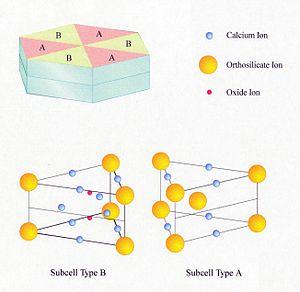 3S in cement chemist notation), typically with 3-4% of substituent oxides.[1] It is the major, and characteristic, phase in Portland cement. The name was given by Törnebohm in 1897 to a crystal identified in microscopic investigation of Portland cement.[2] Hatrurite is the name of a mineral that is substituted C