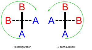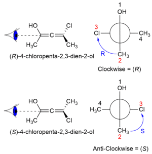 An allene with two different substituents on each of the two carbon atoms will be chiral because there will no longer be any mirror planes. The chirality of these types of allenes was first predicted in 1875 by Jacobus Henricus van 't Hoff, but not proven experimentally until 1935.[3] Where A has a greater priority than B according to the Cahn–Ingold–Prelog priority rules, the configuration of the axial chirality can be determined by considering the substituents on the front atom followed by the back atom when viewed along the allene axis. For the back atom, only the group of higher priority need be considered.