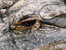 - Integumentary sense organs: Both crocodiles and alligators have small, pit-like sensory organs called integumentary sense organs (ISOs) or dermal pressure receptors (DPRs) surrounding their upper and lower jaws.[45] These organs allow crocodilians to detect minor pressure changes in surrounding water, and assist them in locating and capturing prey. In crocodiles, however, such organs extend over nearly the entire body.[45] Crocodile ISOs may also assist in detection of local salinity, or serve other chemosensory functions.[45]