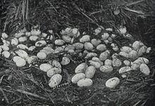 In summer, the female builds a nest of vegetation where the decomposition of the vegetation provides the heat needed to incubate the eggs. The sex of the offspring is determined by the temperature in the nest and is fixed within seven to 21 days of the start of incubation. Incubation temperatures of 86 °F (30 °C) or lower produce a clutch of females; those of 93 °F (34 °C) or higher produce entirely males. Nests constructed on leaves are hotter than those constructed on wet marsh, so the former tend to produce males and the latter, females. The baby alligator's egg tooth helps it get out of its egg during hatching time. The natural sex ratio at hatching is five females to one male. Females hatched from eggs incubated at 86 °F (30 °C) weigh significantly more than males hatched from eggs incubated at 93 °F (34 °C).[34] The mother defends the nest from predators and assists the hatchlings to water. She will provide protection to the young for about a year if they remain in the area. Adult alligators regularly cannibalize younger individuals, though estimates of the rate of cannibalism vary widely.[35][36] In the past, immediately following the outlawing of alligator hunting, populations rebounded quickly due to the suppressed number of adults preying upon juveniles, increasing survival among the young alligators.
