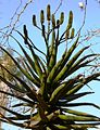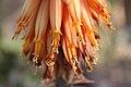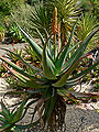 Most Aloe species have a rosette of large, thick, fleshy leaves. Aloe flowers are tubular, frequently yellow, orange, pink, or red, and are borne, densely clustered and pendant, at the apex of simple or branched, leafless stems. Many species of Aloe appear to be stemless, with the rosette growing directly at ground level; other varieties may have a branched or unbranched stem from which the fleshy leaves spring. They vary in color from grey to bright-green and are sometimes striped or mottled. Some aloes native to South Africa are tree-like (arborescent).[7]