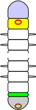 Annelids with blood vessels use metanephridia to remove soluble waste products, while those without use protonephridia.[7] Both of these systems use a two-stage filtration process, in which fluid and waste products are first extracted and these are filtered again to re-absorb any re-usable materials while dumping toxic and spent materials as urine. The difference is that protonephridia combine both filtration stages in the same organ, while metanephridia perform only the second filtration and rely on other mechanisms for the first – in annelids special filter cells in the walls of the blood vessels let fluids and other small molecules pass into the coelomic fluid, where it circulates to the metanephridia.[34] In annelids the points at which fluid enters the protonephridia or metanephridia are on the forward side of a septum while the second-stage filter and the nephridiopore (exit opening in the body wall) are in the following segment. As a result, the hindmost segment (before the growth zone and pygidium) has no structure that extracts its wastes, as there is no following segment to filter and discharge them, while the first segment contains an extraction structure that passes wastes to the second, but does not contain the structures that re-filter and discharge urine.[7]