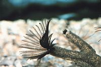 Earthworms make a significant contribution to soil fertility.[41] The rear end of the Palolo worm, a marine polychaete that tunnels through coral, detaches in order to spawn at the surface, and the people of Samoa regard these spawning modules as a delicacy.[41] Anglers sometimes find that worms are more effective bait than artificial flies, and worms can be kept for several days in a tin lined with damp moss.[46] Ragworms are commercially important as bait and as food sources for aquaculture, and there have been proposals to farm them in order to reduce over-fishing of their natural populations.[45] Some marine polychaetes' predation on molluscs causes serious losses to fishery and aquaculture operations.[41]