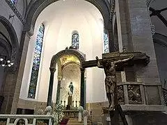 An apse is a semicircular recess, often covered with a hemispherical vault. Commonly, the apse of a church, cathedral or basilica is the semicircular or polygonal termination to the choir or sanctuary, or sometimes at the end of an aisle. In church architecture it is generally the name given to where the altar is placed or where the clergy are seated.[2] An apse is occasionally found in a synagogue, e.g. Maoz Haim Synagogue.