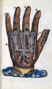 Around the same time, François de la Noue is also reported to have had an iron hand, as is, in the 17th Century, René-Robert Cavalier de la Salle.[21] Henri de Tonti had a prosthetic hook for a hand. During the Middle Ages, prosthetic remained quite basic in form. Debilitated knights would be fitted with prosthetics so they could hold up a shield, grasp a lance or a sword, or stabilize a mounted warrior.[22] Only the wealthy could afford anything that would assist in daily life.