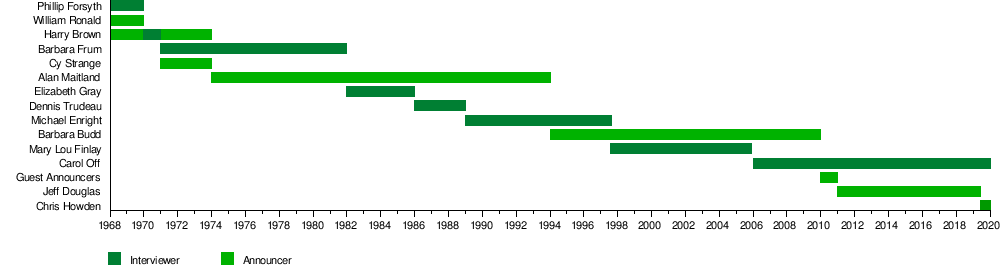- 1971–1973: Barbara Frum, Harry Brown, Cy Strange