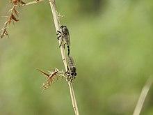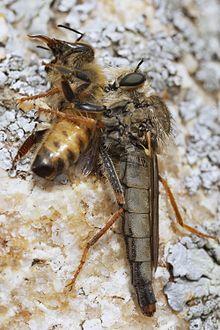 With regard to the specificity of the trophic relationship, Wood (1981)[2] mentions the existence of some studies in the literature on the subject. Some genera have been found to be monophagic, but more generally the Asilidae manifest a more or less wide polyphagia with behaviors that vary from stenophagia[8] to euriphagia.[2] However, there are cases of stenohage asilids which if necessary focus their predatory activity against a species when this forms large populations.