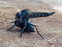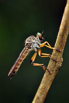 The Asilidae are the robber fly family, also called assassin flies. They are powerfully built, bristly flies with a short, stout proboscis enclosing the sharp, sucking hypopharynx.[1][2] The name "robber flies" reflects their notoriously aggressive predatory habits; they feed mainly or exclusively on other insects and as a rule they wait in ambush and catch their prey in flight.