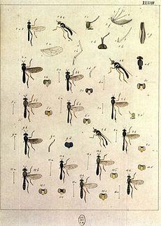 Carl Linnaeus (Linné; 1758), in the tenth edition of Systema naturae, erected the genus Asilus, including 11 species, and added 4 others in the twelfth edition (1767). Asilus crabroniformis (1758) is the type of the genus. The rank of family is credited to Leach in Samouelle (1819). Johan Christian Fabricius in five publications dated from 1775 to 1805, erected the genus Damalis and described 76 exotic and European species. Wiedemann, in publications appearing between 1817 and 1830, described 235 species, many exotic. Johann Wilhelm Meigen in an early work of 1803 erected 4 genera, 3 of which now represent subfamilies. He also described many species in Systematische Beschreibung der bekannten europäischen zweiflügeligen Insekten (1800 to 1838). During the rest of the nineteenth century there were significant contributions by Hermann Loew in particular. Other prominent authors dealing with the Asilidae during the nineteenth century included Pierre-Justin-Marie Macquart, Francis Walker, Camillo Rondani and Jacques-Marie-Frangile Bigot.
