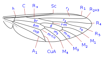 Longitudinal veins: C: costa; Sc: subcosta; R: radius; M: media; Cu: cubitus; A: anal.
