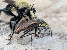 In general the family attacks a very wide range of prey, including other flies, beetles, butterflies and moths, various bees, ants, dragon and damselflies, ichneumon wasps, grasshoppers, and some spiders. They do so apparently irrespective of any repugnatorial chemicals the prey may have at its disposal.[5] Many Asilidae when attacked in turn do not hesitate to defend themselves with their proboscides and may deliver intensely painful bites if handled incautiously.