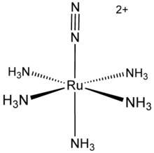 The first example of a dinitrogen complex to be discovered was [Ru(NH3)5(N2)]2+ (see figure at right), and soon many other such complexes were discovered. These complexes, in which a nitrogen molecule donates at least one lone pair of electrons to a central metal cation, illustrate how N2 might bind to the metal(s) in nitrogenase and the catalyst for the Haber process: these processes involving dinitrogen activation are vitally important in biology and in the production of fertilisers.[46][47]