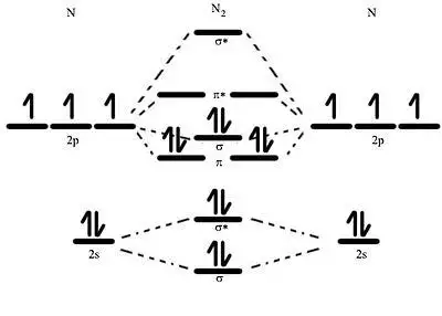 Given the great reactivity of atomic nitrogen, elemental nitrogen usually occurs as molecular N2, dinitrogen. This molecule is a colourless, odourless, and tasteless diamagnetic gas at standard conditions: it melts at −210 °C and boils at −196 °C.[23] Dinitrogen is mostly unreactive at room temperature, but it will nevertheless react with lithium metal and some transition metal complexes. This is due to its bonding, which is unique among the diatomic elements at standard conditions in that it has an N≡N triple bond. Triple bonds have short bond lengths (in this case, 109.76 pm) and high dissociation energies (in this case, 945.41 kJ/mol), and are thus very strong, explaining dinitrogen's chemical inertness.[23]