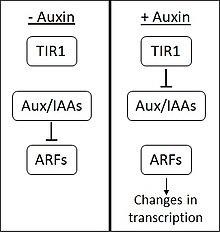 When a plant cell comes into contact with auxin, it causes dramatic changes in gene expression, with many genes up- or down-regulated. The precise mechanisms by which this occurs are still an area of active research, but there is now a general consensus on at least two auxin signalling pathways.[11][12]