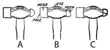 Variants include the straight-peen, diagonal-peen, and cross-peen hammer. These hammers have a wedge-shaped head instead of a ball-shaped head. This wedge shape spreads the metal perpendicular to the edge of the head. The straight-peen hammer has the wedge oriented parallel to the hammer's handle, while the cross-peen hammer's wedge is oriented perpendicular. The diagonal-peen hammer's head, as the name implies, is at a 45° angle from the handle. They are commonly used by blacksmiths during the forging process to deliver blows for forging or to strike other forging tools.