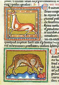 Two illuminated Psalters, the Queen Mary Psalter (British Library Ms. Royal 2B, vii) and the Isabella Psalter (State Library, Munich), contain full Bestiary cycles. The bestiary in the Queen Mary Psalter is found in the "marginal" decorations that occupy about the bottom quarter of the page, and are unusually extensive and coherent in this work. In fact the bestiary has been expanded beyond the source in the Norman bestiary of Guillaume le Clerc to ninety animals. Some are placed in the text to make correspondences with the psalm they are illustrating.[2]