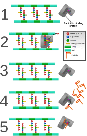 β-lactam antibiotics are bactericidal, and act by inhibiting the synthesis of the peptidoglycan layer of bacterial cell walls. The peptidoglycan layer is important for cell wall structural integrity,[6] especially in Gram-positive organisms, being the outermost and primary component of the wall. The final transpeptidation step in the synthesis of the peptidoglycan is facilitated by DD-transpeptidases, also known as penicillin binding proteins (PBPs). PBPs vary in their affinity for penicillin and other β-lactam antibiotics. The number of PBPs varies between bacterial species.[9]