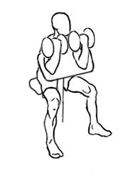 - Dumbbell preacher curl: Sit on a preacher bench and adjust the seat height to a comfortable position. Keep the back of upper arms tightly attached to the preacher bench with a dumbbell in each hand. Flex the elbows until they are almost fully extended and curl the dumbbells towards shoulder until the biceps are fully contracted. Then return the dumbbells to the initial position for another repetition.[22]