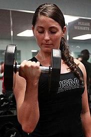 Although this exercise has many variations, a common factor of them is a 'curling' motion, where a weight (attached to, or used in conjunction with, an item of equipment) is lifted until the biceps is fully contracted, which is approximately at the shoulder level.[6] Some variations include partial reps (such as the " 21 Gun salute") focusing on the top or bottom parts of the bicep.[7] With the elbows and upper arm is remaining close to the body.[8]