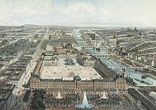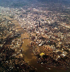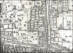 A distinction is sometimes drawn between a bird's-eye view and a bird's-flight view, or "view-plan in isometrical projection".[2] Whereas a bird's-eye view shows a scene from a single viewpoint (real or imagined) in true perspective, including, for example, the foreshortening of more distant features, a bird's-flight view combines a vertical plan of ground-level features with perspective views of buildings and other standing features, all presented at roughly the same scale.[3] The landscape appears "as it would unfold itself to any one passing over it, as in a balloon, at a height sufficient to abolish sharpness of perspective, and yet low enough to allow of distinct view of the scene beneath".[4] The technique was popular among local surveyors and cartographers of the sixteenth and early seventeenth centuries.