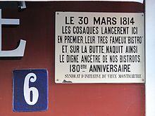 The etymology is unclear, and is presumed to come from a regional word: bistro, bistrot, bistingo, bistraud, bistouille or bistrouille. The first recorded use of the word appears in 1884.[2] A popular folk etymology of the word claims that it originated among Russian troops who occupied Paris following the Napoleonic Wars (from быстро, "quickly"), which was allegedly shouted by Russian officers or Cossacks who wanted to be served quickly. This etymology has been discredited by some French linguists, as there is no attestation to the occurrence of this word until the end of the 19th century.[3][4]