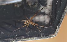 Like other members of the Theridiidae, widow spiders construct a web of irregular, tangled, sticky silken fibres. Black widow spiders prefer to nest near the ground in dark and undisturbed areas, usually in small holes produced by animals, or around construction openings or wood piles. Indoor nests are in dark, undisturbed places such as under desks or furniture or in a basement.[15] The spider frequently hangs upside down near the centre of its web and waits for insects to blunder in and get stuck. Then, before the insect can extricate itself, the spider rushes over to envenomate and wrap it in silk. To feed, the spider's mouth pulses digestive juices over the prey, which liquifies—and then the spider internalizes by capillary action, sucking the slurry into its mouth.[16][17] Their prey consists of small insects such as flies, mosquitoes, grasshoppers, beetles, and caterpillars.[17] If the spider perceives a threat, it quickly lets itself down to the ground on a safety line of silk.