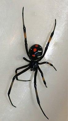 Latrodectus is a broadly distributed genus of spiders with several species that, together, are referred to as true widows. This group is composed of those often loosely called black widow spiders, brown widow spiders, and similar spiders.[3][4][5][6] However, such general "common names" are of limited use as the diversity of species is much greater. A member of the family Theridiidae, this genus contains 32 species,[7] which include several North American "black widows" (southern black widow Latrodectus mactans, western black widow Latrodectus hesperus, and northern black widow Latrodectus variolus). In addition to these in North America are also the red widow Latrodectus bishopi and the brown widow Latrodectus geometricus, which, in addition to North America, has a much wider geographic distribution. Elsewhere, others include the European black widow (Latrodectus tredecimguttatus), the Australian redback black widow (Latrodectus hasseltii), several different species in Southern Africa that can be called Button spiders, and the South American black widow spiders (Latrodectus corallinus and Latrodectus curacaviensis). Species vary widely in size. In most cases, the females are dark-coloured, but some may have lighter bodies or even reddish. Many can have red, white or brown markings on the upper-side (dorsal) of the abdomen. Some can be readily identifiable by reddish markings on the central underside (ventral) abdomen, which are often hourglass-shaped.
