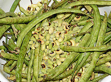 The black eye pea is cultivated throughout the world.[1] Most of the black-eyed pea cultivation occurred in the Southern United States as early as the 17th century in Virginia.[2] The crop would also eventually prove popular in Texas. Throughout the South, the black-eyed pea is still a widely used ingredient in soul food and cuisines of the Southern United States. The planting of crops of black-eyed peas was promoted by George Washington Carver because, as a legume, it adds nitrogen to the soil and has high nutritional value. Black-eyed peas contain calcium (41 mg), folate (356 μg), protein (13.22 g), fiber (11.1 g) and vitamin A (26 IU), among other nutrients, with less than 840 kilojoules (200 kilocalories) of food energy in a 171-gram (6 oz) serving.[3]