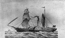 Cunard's first serious competition for the record came from the American-owned Collins Line.[3] The American Government supplied Collins with a substantial subsidy to operate four wooden paddlers that were superior to Cunard's best.[19] In its first year, 1850, the Pacific set the record at 12.46 knots (23.08 km/h) on a 10-day run from Liverpool to New York. Unfortunately, Collins suffered a setback when its Arctic foundered with heavy loss of life.[3] The next year, Cunard put further pressure on Collins by commissioning its first iron-hulled paddler, the Persia, which set a new record with a 9-day, 16-hour Liverpool-New York voyage at 13.11 knots (24.28 km/h).[18] During the Crimean War, Cunard supplied eleven of its ships for war service and suspended all routes except the Liverpool-Halifax-Boston service.[19] While the Collins' fortunes improved because of the lack of competition during the war, Collins collapsed in 1858 after the loss of two additional steamers.[3] Cunard emerged as the leading carrier of first class passengers and in 1862 commissioned the Scotia, the last paddle steamer to set a record with a Queenstown-New York voyage at 14.46 knots (26.78 km/h). Scotia was the final significant paddler ordered for the Atlantic because under the terms of Cunard's mail contract with the Admiralty, it was still required to supply paddle steamers when needed for military service.[1]