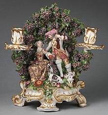 Bocage may also refer to a small forest, a decorative element of leaves, or a type of rubble-work, comparable with the English use of "rustic" in relation to garden ornamentation. In the decorative arts, especially porcelain, it refers to a leafy screen spreading above and behind figures. Though found on continental figures, it is something of an English speciality, beginning in the mid-18th century, especially in Chelsea porcelain, and later spreading to more downmarket Staffordshire pottery figures.