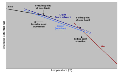 The phenomenon of freezing-point depression is analogous to boiling point elevation. However, the magnitude of the freezing point depression is larger than the boiling point elevation for the same solvent and the same concentration of a solute. Because of these two phenomena, the liquid range of a solvent is increased in the presence of a solute.