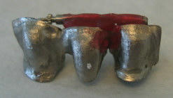 The proximal surfaces of the sectioned units (that is, the adjacent surfaces of the metal at the cut) are roughened and the relationship is preserved with a material that will hold on to both sides, such as PATTERN RESIN™ from the company GC America[33]. With the two bridge abutments individually seated on their prepared abutment teeth, the resin is applied to the location of the sectioning to reestablish a proper spatial relationship between the two pieces. This can then be sent to the lab where the two pieces will be soldered and returned for another try-in or final cementation.