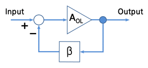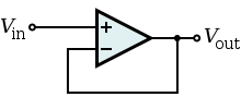 A unity gain buffer amplifier may be constructed by applying a full series negative feedback (Fig. 2) to an op-amp simply by connecting its output to its inverting input, and connecting the signal source to the non-inverting input (Fig. 3). Unity gain here implies a voltage gain of one (i.e. 0 dB), but significant current gain is expected. In this configuration, the entire output voltage (β = 1 in Fig. 2) is fed back into the inverting input. The difference between the non-inverting input voltage and the inverting input voltage is amplified by the op-amp. This connection forces the op-amp to adjust its output voltage simply equal to the input voltage (Vout follows Vin so the circuit is named op-amp voltage follower).