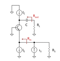 Figure 6 shows a bipolar current buffer biased with a current source (designated IE for DC emitter current) and driving another DC current source as active load (designated IC for DC collector current). The AC input signal current iin is applied to the emitter node of the transistor by an AC Norton current source with Norton resistance RS. The AC output current iout is delivered by the buffer via a large coupling capacitor to load RL. This coupling capacitor is large enough to be a short circuit at frequencies of interest.