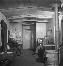 Use of cabooses began in the 1830s, when railroads housed trainmen in shanties built onto boxcars or flatcars.[7] The caboose provided the train crew with a shelter at the rear of the train. The crew could exit the train for switching or to protect the rear of the train when stopped. They also inspected the train for problems such as shifting loads, broken or dragging equipment, and hot boxes (overheated axle bearings, a serious fire and derailment threat). The conductor kept records and handled business from a table or desk in the caboose. For longer trips, the caboose provided minimal living quarters, and was frequently personalized and decorated with pictures and posters.
