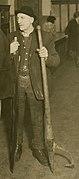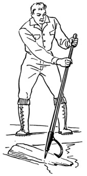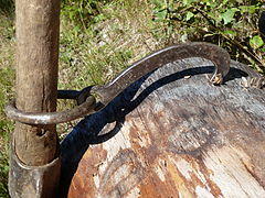 A logging tool description from the Lumberman's Museum at Patten, Maine, reads in part: "A cant dog or cant hook was used for lifting, turning, and prying logs when loading sleds and on the drive. At first, a swivel hook on a pole with nothing to hold it in position was used. This was called a swing dingle."[2] However, the term swing dingle is more often published as being a type of logging sled.[3] These early types are also called a ring dog or ring dog cant hook.[4] In 1858, Joseph Peavey, a blacksmith in Stillwater, Maine, made a rigid clasp to encircle the cant dog handle with the hook on one side. It moved up and down, but not sideways. All loggers have used it ever since."