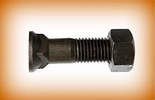 The plough bolt is a flush-fitting carriage bolt, whose head is countersunk beneath the surface of the wood. The plough bolt was devised to hold replaceable ploughshares to the mouldboards of iron ploughs. The share, the fastest-wearing part of the plough, would be replaced several times over the life of the plough. Such bolts continue to be used to hold shovels onto cultivators.