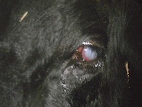 The most common form of the disease is the head and eye form. Typical symptoms of this form include fever, depression, discharge from the eyes and nose, lesions of the buccal cavity and muzzle, swelling of the lymph nodes, opacity of the corneas leading to blindness, inappetence and diarrhea. Some animals have neurologic signs, such as ataxia, nystagmus, and head pressing. Animals that become infected with the virus can become extremely sensitive to touch, especially around the head. It is also possible that become aggressive and charge at approaching animals and people. If the virus continues untreated, seizures could develop. Affected animal usually die five to ten days of the first signs of clinical signs. Once the cow shows clinical signs there is no chance of recovering.[26]