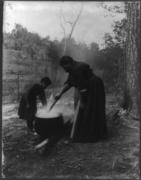 African American woman and child outdoors, standing by boiling cauldron of water, c. 1901.