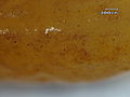 On the apple tree, the infections occur on leaves, fruit and young twigs.[2] The brightly colored spots produced on the leaves make it easy to identify. Small, pale yellow spots appear on the upper surfaces of the leaves, usually during late April or May on the eastern seaboard of the United States. These spots gradually enlarge and turn orange or red and may show concentric rings of color. Drops of orange liquid may be visible on the spots. Later in the season, black dots appear on the orange spots on the upper leaf surface. In late summer, tube-like structures develop on the undersurface of the apple leaf. Infected leaves sometimes drop prematurely, particularly during drought conditions or when the tree is under additional stress. Infections on fruit are usually near the blossom end and are somewhat similar to the leaf lesions.