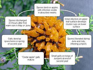 Understanding of the disease cycle of this rust fungus is necessary for proper identification and control. Cedar apple rust is caused by the fungi Gymnosporangium or more specifically Gymnosporangium juniperi-virginianae that spend part of their life cycles on Eastern Red Cedars growing near orchards. The complex disease cycle of cedar apple rust, alternating between two host plants, was first delineated by Anders Sandøe Ørsted.[3]
