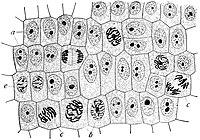 Mitosis is the process by which a eukaryotic cell separates the chromosomes in its cell nucleus into two identical sets in two nuclei.[7] During the process of mitosis the pairs of chromosomes condense and attach to microtubules that pull the sister chromatids to opposite sides of the cell.[8]