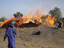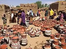 In Mali, a firing mound is used rather than a brick or stone kiln. Unfired pots are first brought to the place where a mound will be built, customarily by the women and girls of the village. The mound's foundation is made by placing sticks on the ground, then: