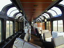 A dome car can include features of a coach car, sleeping car, a lounge car, dining car, and an observation car. Within the United States, the primary manufacturers were The Budd Company (stainless steel construction), The Pullman Company (steel construction), and ACF (American Car & Foundry, aluminum construction). A portion of the car, usually in the center, is split between two levels, with stairs leading both up and down from the train's regular passenger car floor level. The lower level of the dome usually consisted of a small lounge area, while the upper portion was usually coach or lounge seating within a "bubble" of glass on the car's roof. Budd Co. dome cars used curved class, whereas Pullman company cars used flat panels of glass that were positioned at different angles above the roofline. Passengers in the upper portion of the dome were able to see in all directions from a vantage point above the train's roof line. On some dome cars, the lower portion was built as a galley, where car attendants used dumbwaiters to transfer items between the galley and a dining area in the dome portion of the car. In the United States, the Union Pacific railroad was the primary user of dome dining cars in the pre-Amtrak era.