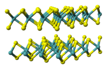 Metal dichalcogenides have the formula ME2, where M = a transition metal and E = S, Se, Te.[7] As usual, the most important members are the sulfides. They are always dark diamagnetic solids, insoluble in all solvents, and exhibiting semiconducting properties. In terms of their electronic structures, these compounds are usually viewed as derivatives of M4+, where M4+ = Ti4+ (d0 configuration), V4+ (d1 configuration), Mo4+ (d2 configuration). Titanium disulfide was investigated in prototype cathodes for secondary batteries, exploiting its ability to reversibly undergo intercalation by lithium. Molybdenum disulfide, the subject of many thousand publications, is the main ore of molybdenum where it is called molybdenite. It is used as a solid lubricant and catalyst for hydrodesulfurization. The corresponding diselenides and even ditellurides are known, e.g., TiSe2, MoSe2, and WSe2.